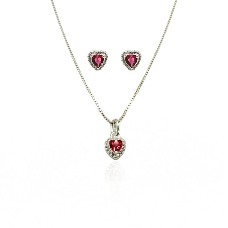 Encante-se com a delicadeza deste conjunto em Prata 925, composto por gargantilha veneziana com pingente de zircônia cristal em forma de coração na cor rosa, e brincos coordenados com o mesmo brilho encantador.