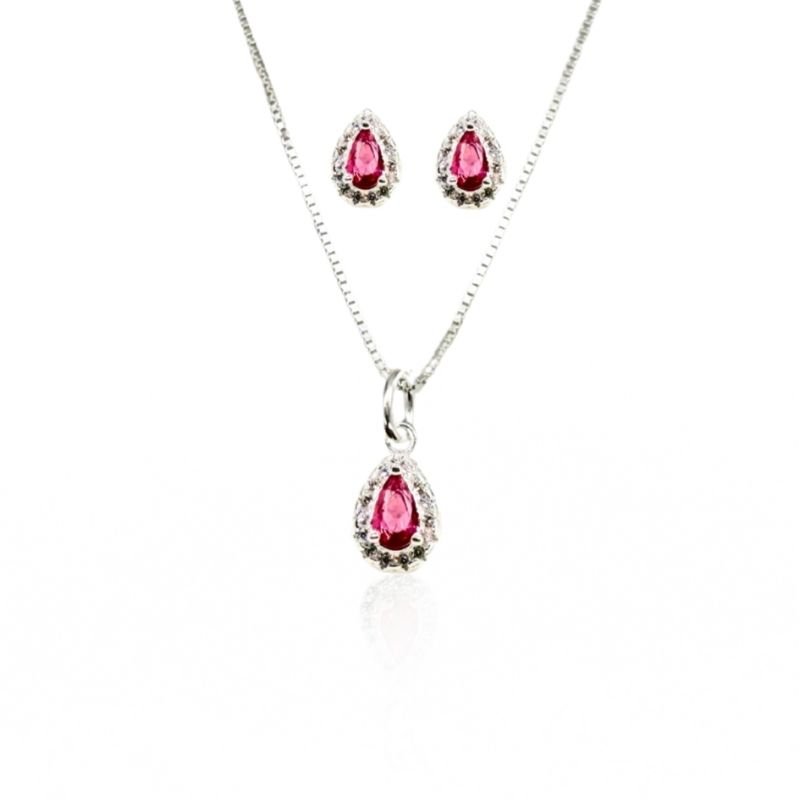 Delicado e cheio de charme, este conjunto em prata 925 é a expressão perfeita de elegância e feminilidade. A gargantilha veneziana traz um pingente em formato de gota com uma zircônia rosa central, rodeada por microzircônias cristalinas que realçam o brilho da peça. Os brincos com o mesmo design completam o conjunto com harmonia e sofisticação.
