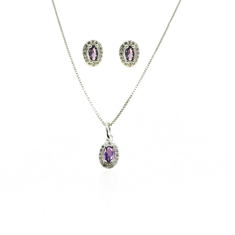 Pingente e brincos com zircônia oval ametista