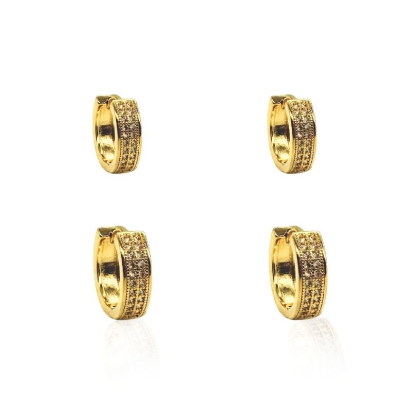 Duo de brincos de argolas banhados a ouro, adornados com delicadas zircônias que garantem brilho sofisticado em qualquer ocasião. O conjunto traz argolas em dois tamanhos diferentes, perfeitas para compor combinações modernas e versáteis. Fecho click prático e seguro.
