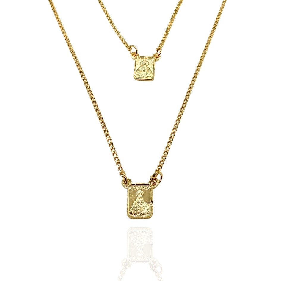 Símbolo de fé e proteção, este escapulário banhado a ouro traz duas medalhas especiais: o Sagrado Coração de Jesus Cristo na frente e, no verso, a imagem de Nossa Senhora Aparecida. Um acessório repleto de significado para fortalecer a espiritualidade no dia a dia.