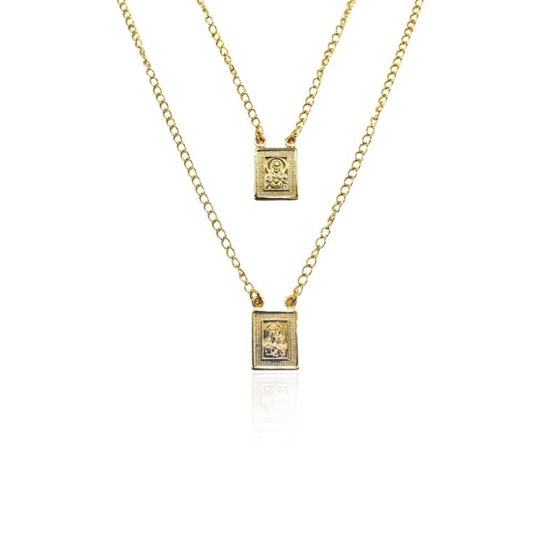 Escapulário dourado trazendo medalhas do Sagrado Coração de Jesus. No verso, gravações especiais de fé: “O Senhor te abençoe e te guarde” e “Pela graça sois salvo”. Uma joia de devoção, proteção e significado espiritual, perfeita para uso diário ou para presentear com carinho.