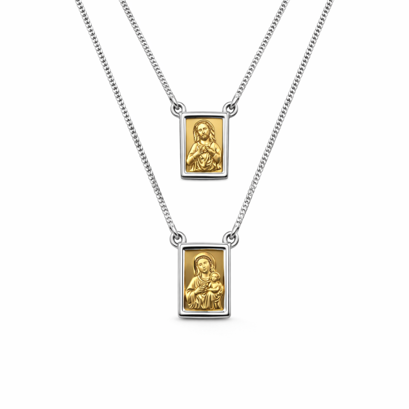 Escapulário em prata 925 com a imagem Jesus Cristo e na outra medalha a imagem de Nossa Senhora com Jesus menino.