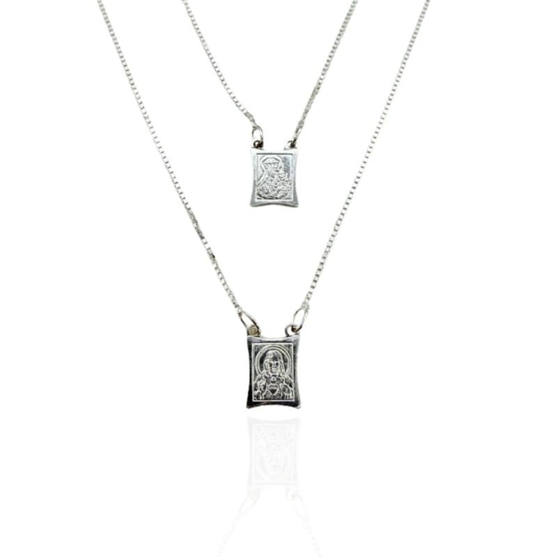 Escapulário com medalhas de Nossa Senhora do Carmo e Sagrado Coração de Jesus.
