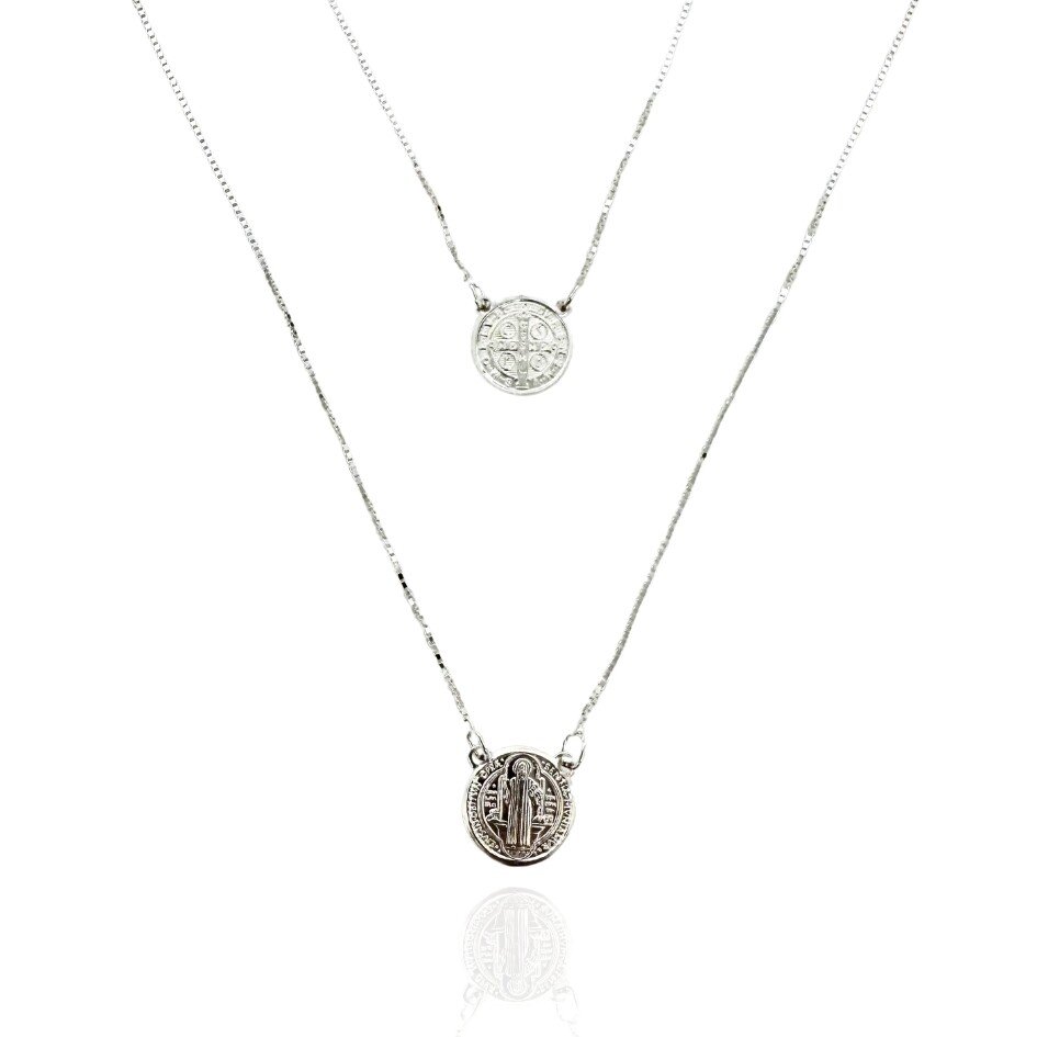 Escapulário com medalhas redondas de São Bento e no verso a cruz.