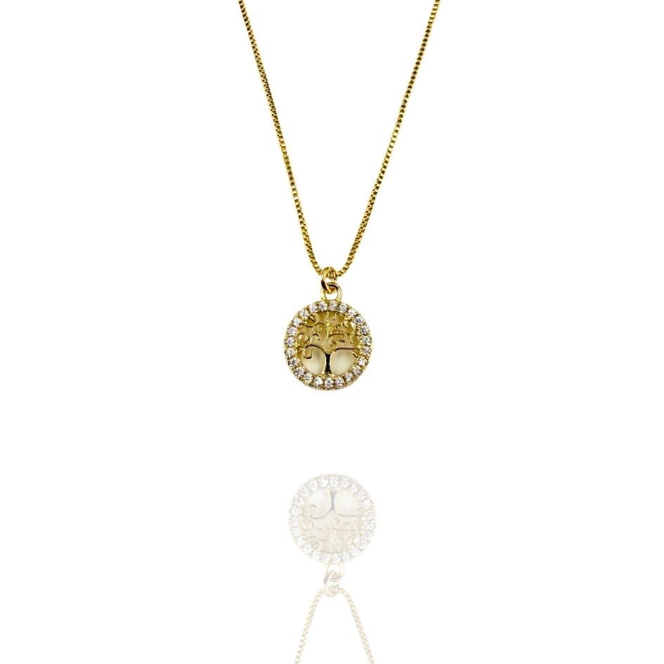 Gargantilha dourada com pingente árvore da vida com microzircônias.