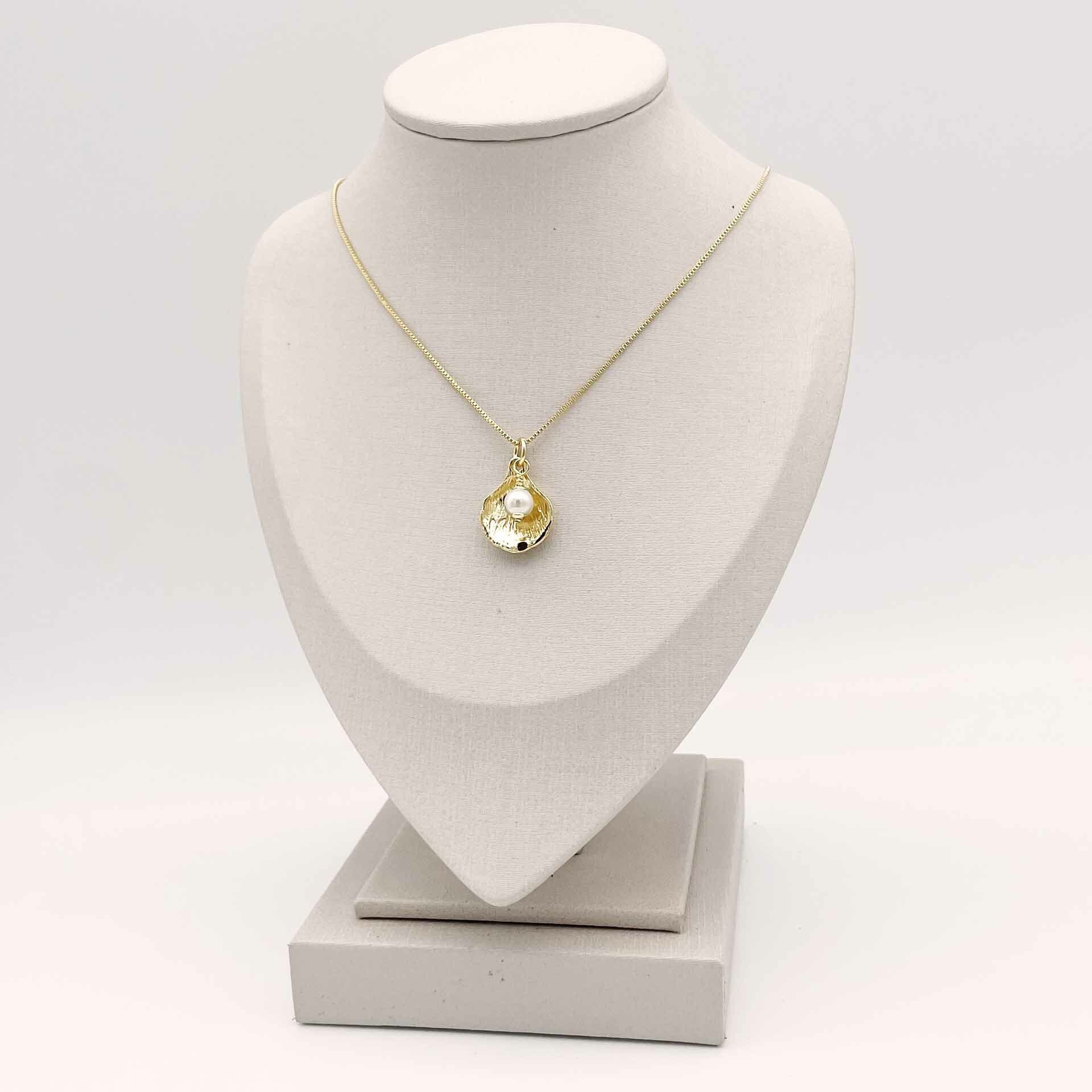 Gargantilha banhada a ouro com pingente em formato de concha e uma pérola.