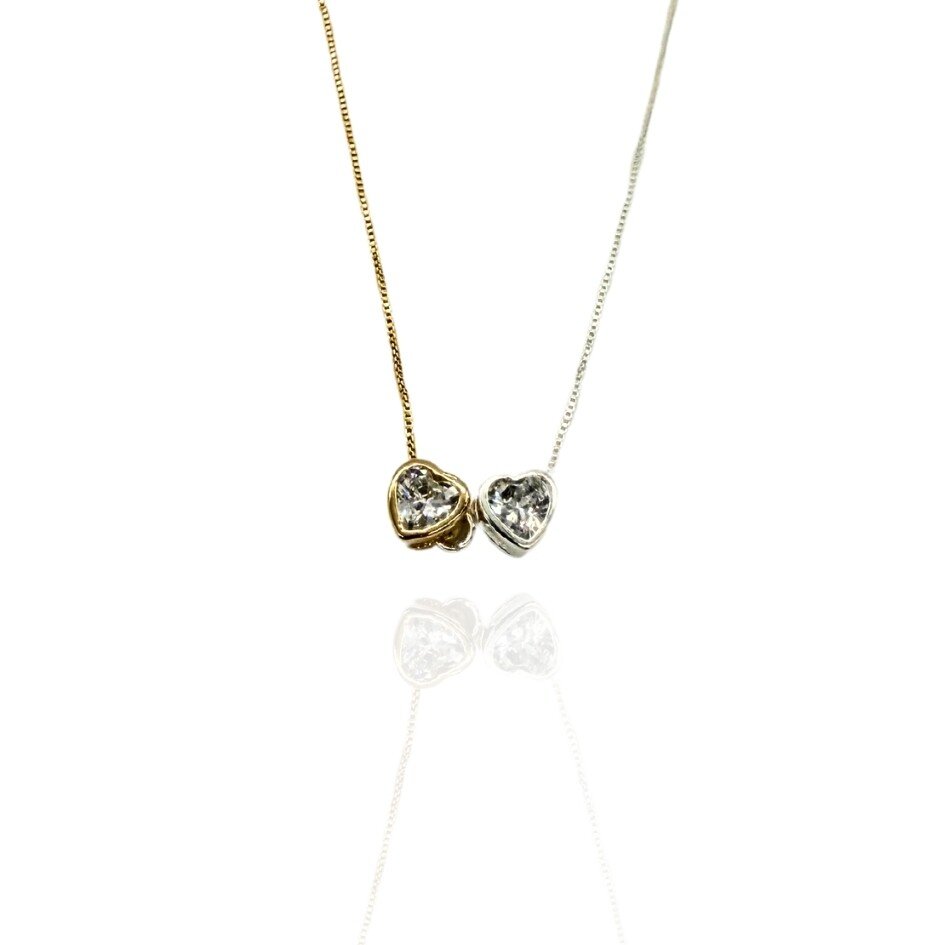 Delicada e romântica, esta gargantilha no estilo veneziana combina o brilho do dourado com o ródio, criando um contraste moderno e elegante. Possui dois encantadores pingentes em formato de corações em zircônia, que trazem um toque de brilho e feminilidade à peça. Ideal para quem ama acessórios delicados com um toque sofisticado.
