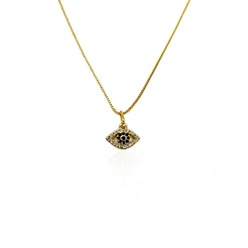 Símbolo de proteção e boas energias, esta gargantilha banhada a ouro apresenta um elegante pingente de olho grego adornado com zircônias brilhantes, que trazem brilho e significado à peça.