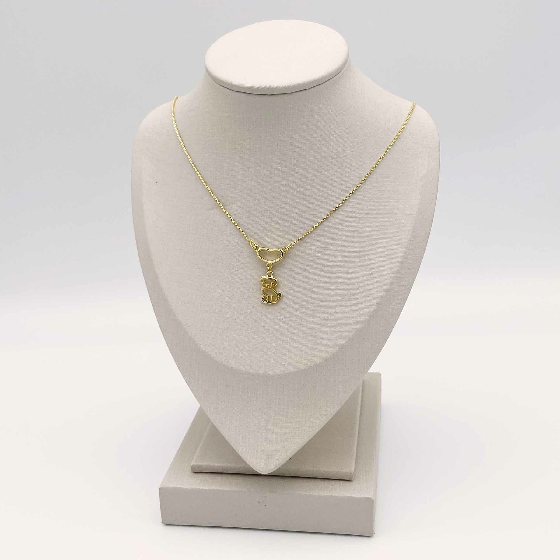 Gargantilha, estilo veneziana, banhada a ouro. Pingente com coração vazado e um cachorrinho.