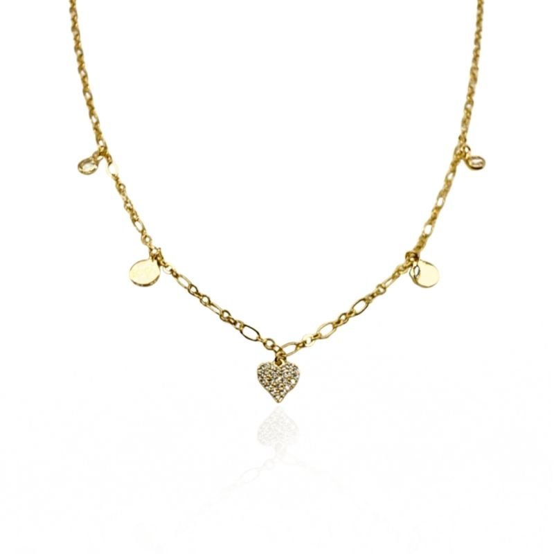 Gargantilha dourada banhada a ouro, com pingente em formato de coração delicadamente cravejado com zircônias, que garantem brilho e romantismo ao acessório. A corrente possui tamanho ajustável, proporcionando conforto e versatilidade para diferentes estilos.