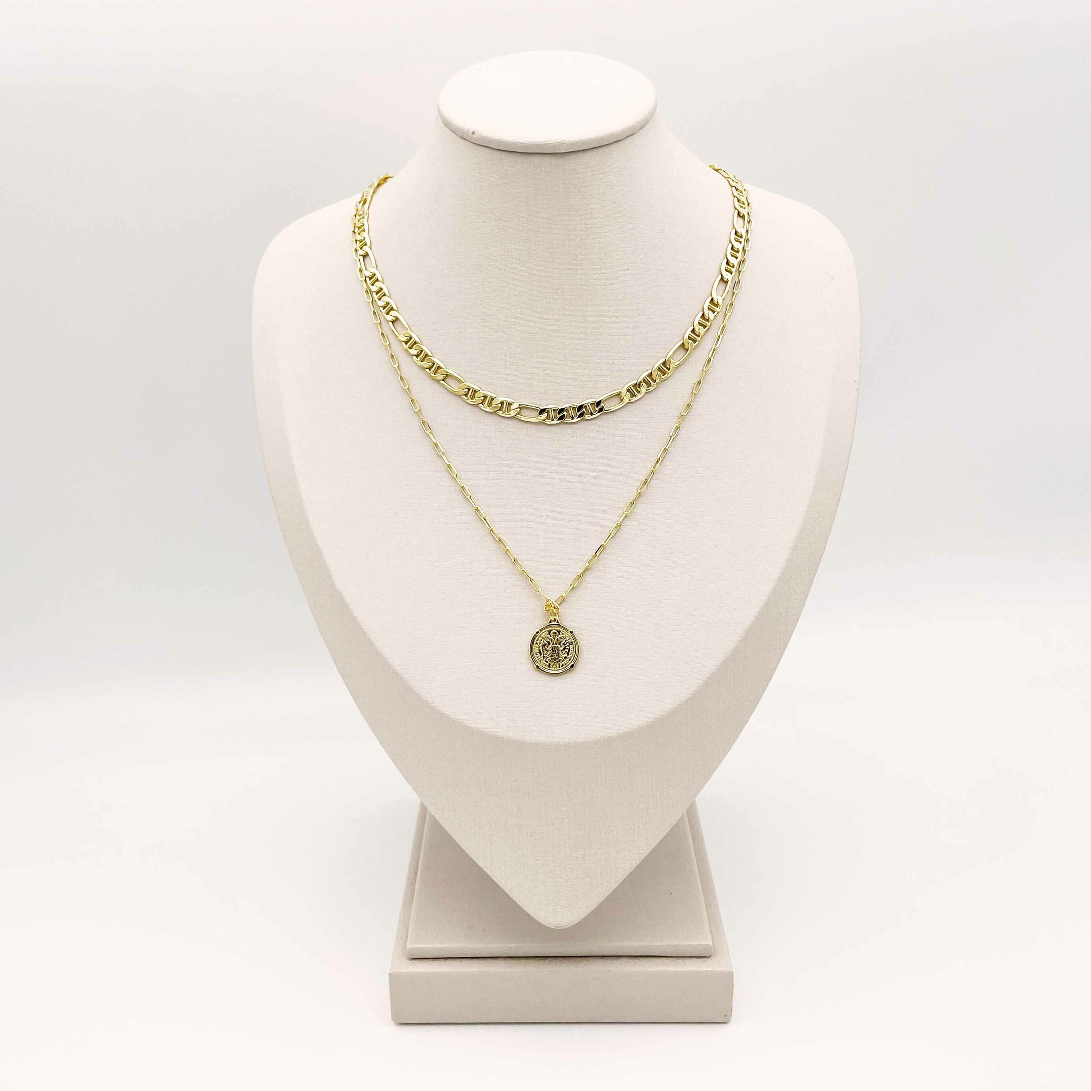 Gargantilha dupla banhada a ouro. Pingente em formato de moeda.