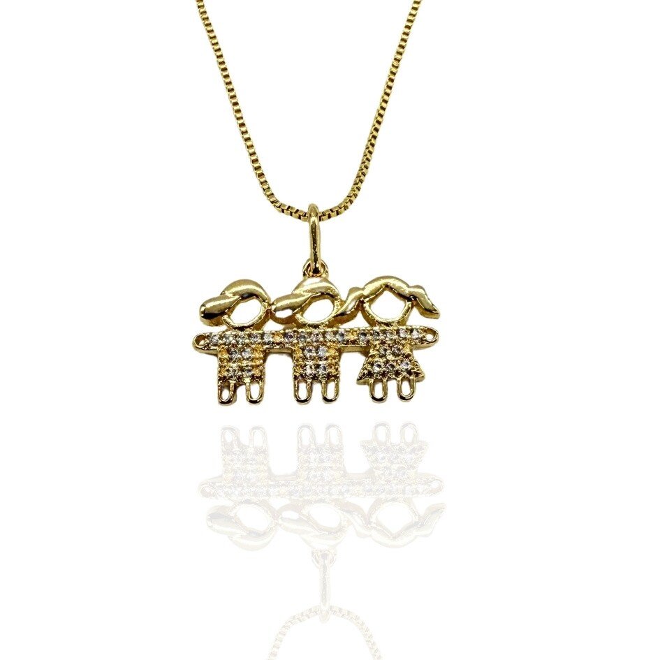 Cheia de significado e afeto, esta gargantilha banhada a ouro apresenta um delicado pingente com a representação de dois meninos e uma menina, simbolizando o amor de mãe ou a união entre irmãos. Uma peça especial para celebrar laços familiares com elegância e carinho.