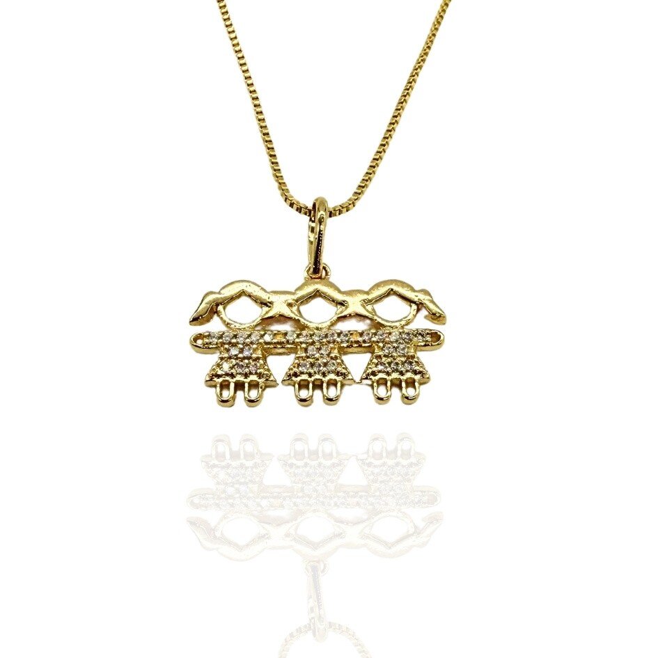 Cheia de significado e afeto, esta gargantilha banhada a ouro apresenta um delicado pingente com a representação de três meninas, simbolizando o amor de mãe ou a união entre irmãos. Uma peça especial para celebrar laços familiares com elegância e carinho.
