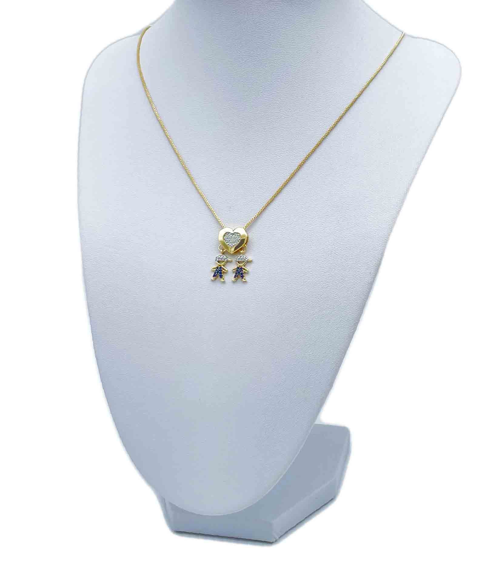 Gargantilha filhos, estilo veneziana, banhada a ouro com pingente em forma de coração com zircônias e pingente de 2 meninos.