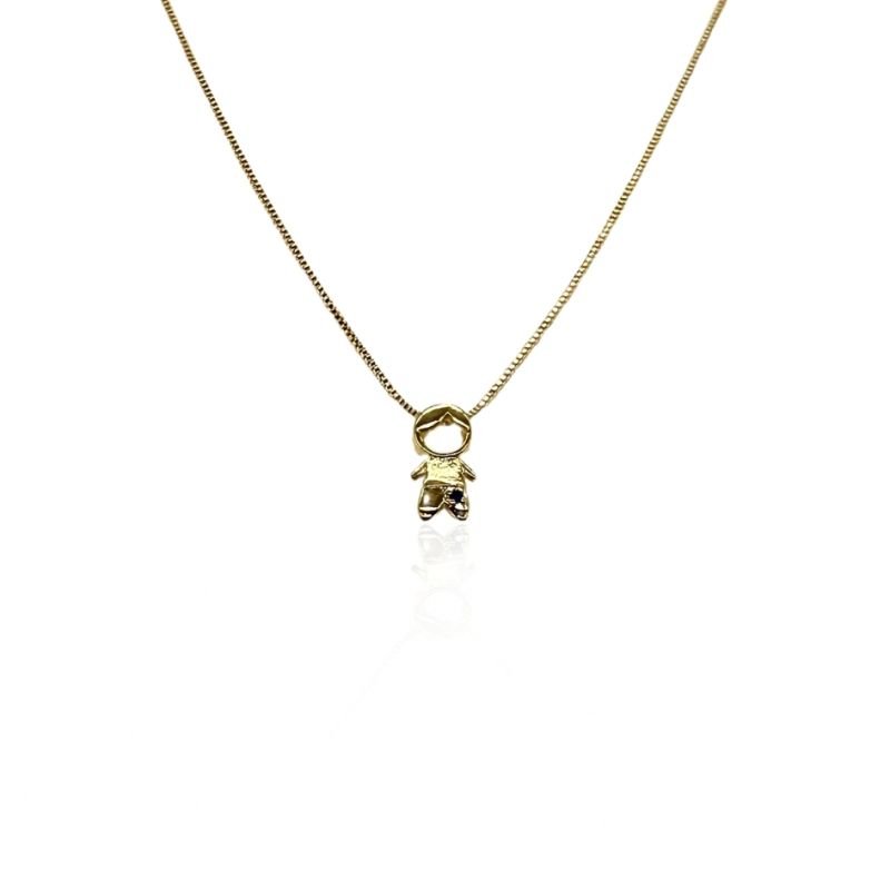 Gargantilha banhada a ouro com delicado pingente em formato de menino, trazendo charme e um toque afetuoso ao visual. Uma peça versátil, perfeita para o dia a dia ou ocasiões especiais.