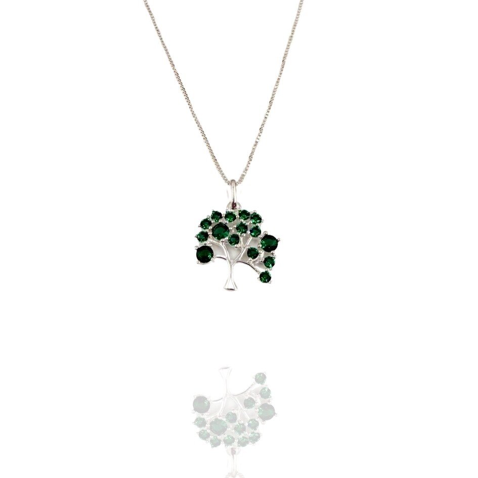 Gargantilha em prata 925 com pingente em formato da árvore da vida com zircônias verdes.