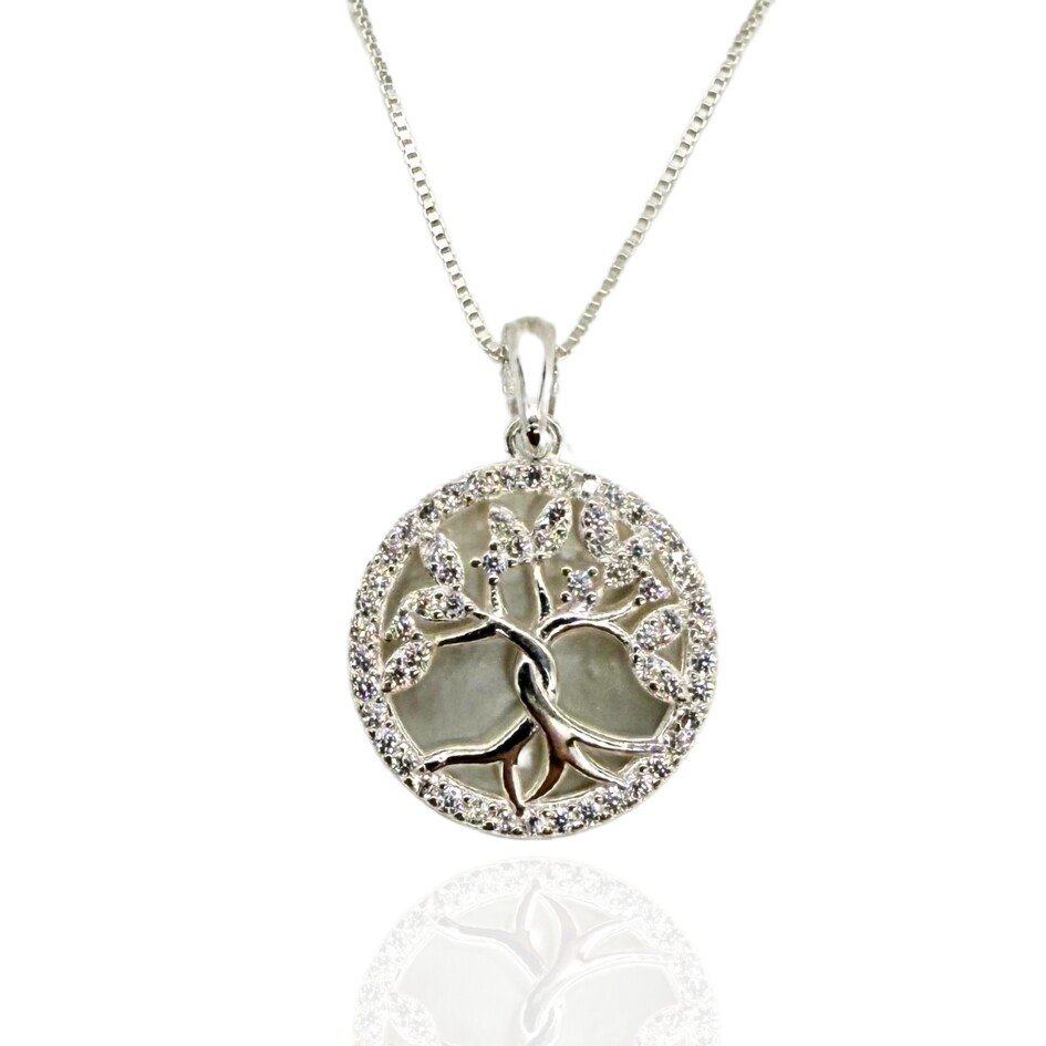 Gargantilha com pingente em formato árvore da vida com zircônias e fundo em madrepérola.