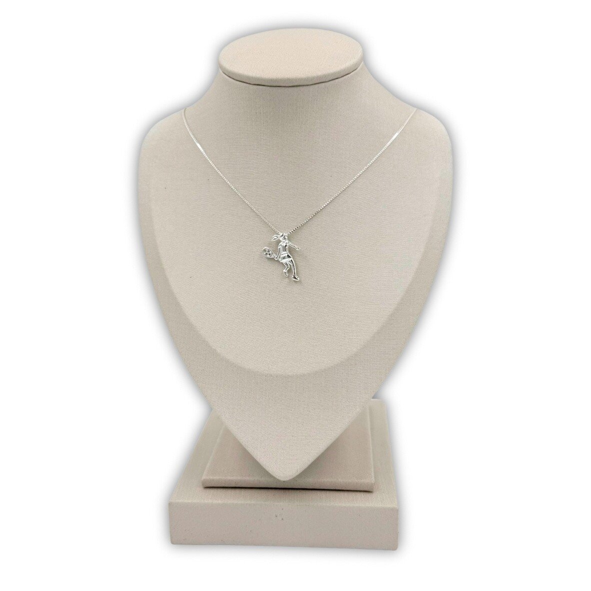 Gargantilha em prata 925 com pingente em formato de uma mulher com raquete de tênis.