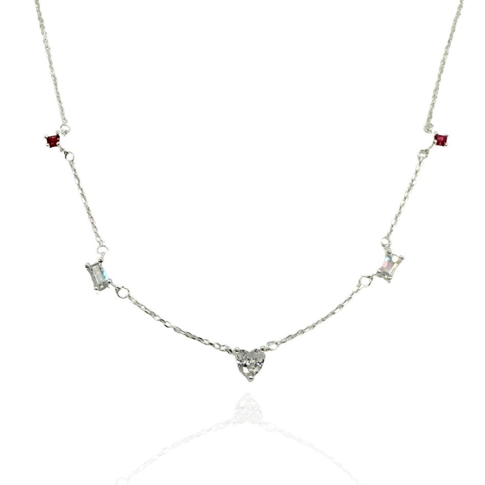 Gargantilha com zircônias cristais em forma de coração e retângulo mais dois pontos de luz na cor vermelha.