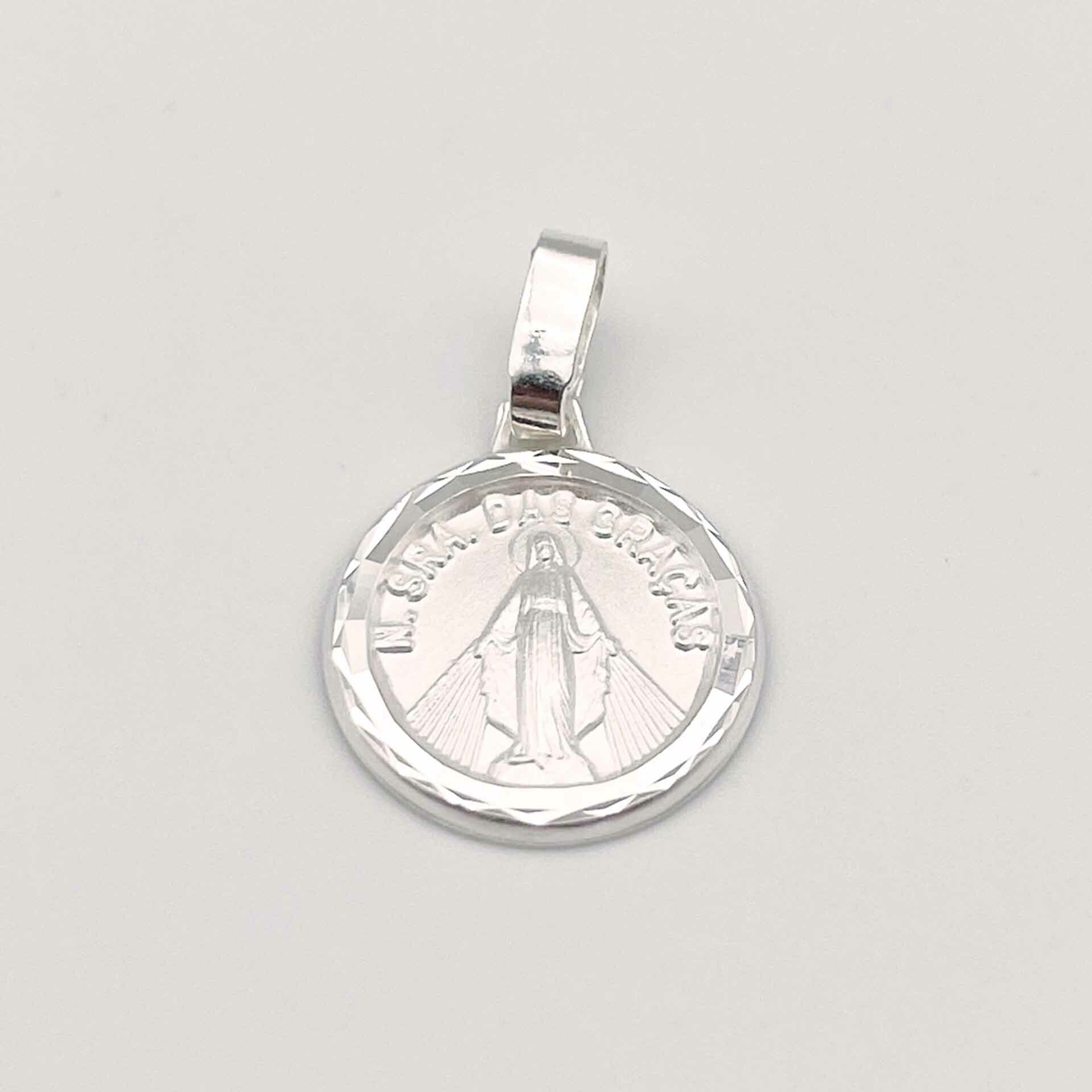 Pingente em prata 925, formato de medalha com a imagem de Nossa Senhora das Graças.