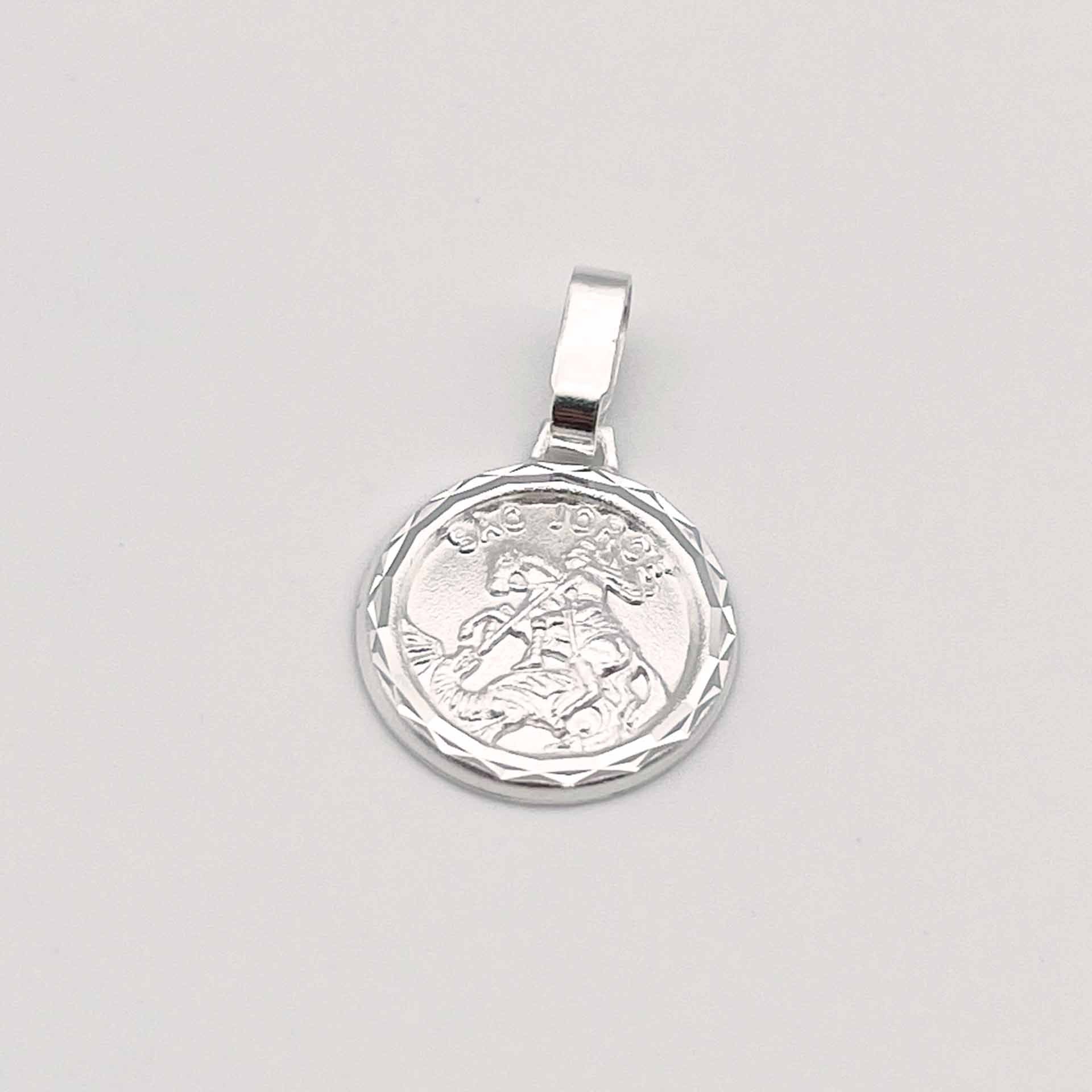 Pingente em prata 925, formato de medalha com a imagem de São Jorge.
