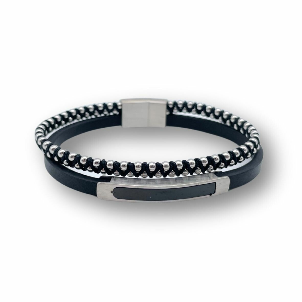 Pulseira confeccionada em couro sintético e metal.