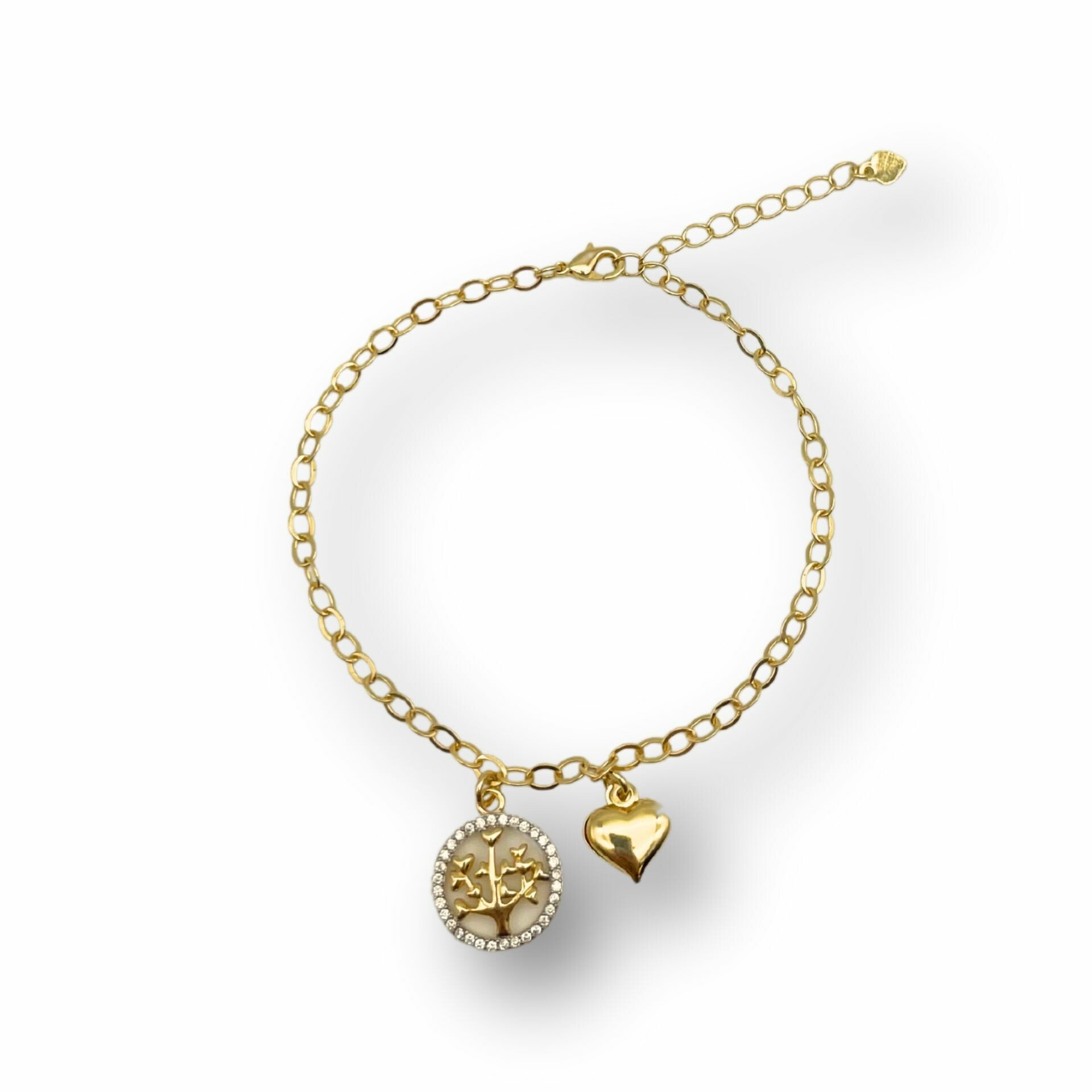 Pulseira banhada a ouro com pingente árvore da vida com zircônias e coração.