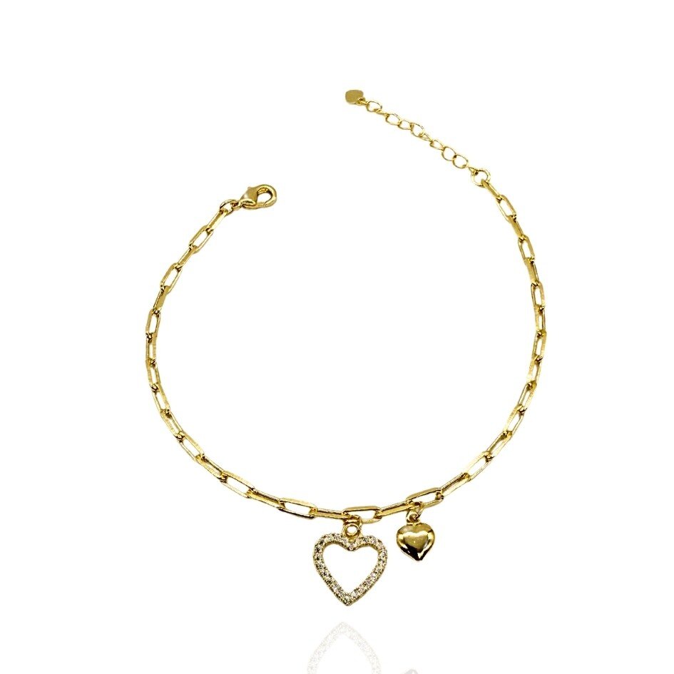 Elegante e romântica, esta pulseira banhada a ouro apresenta pingentes de corações lisos e corações cravejados com microzircônias, proporcionando um toque de brilho e sofisticação ao seu visual. Com tamanho ajustável, é a escolha perfeita para adicionar delicadeza e charme a qualquer look.