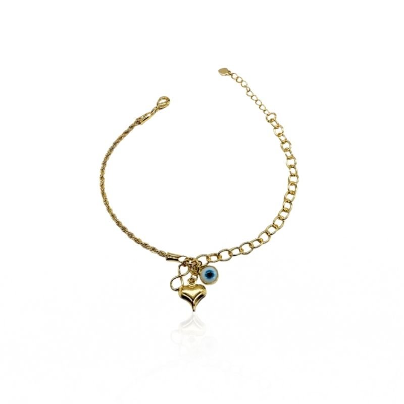 Pulseira banhada a ouro de tamanho ajustável, com delicados pingentes de olho grego, símbolo do infinito e coração. Um acessório que une proteção e amor em uma peça elegante, perfeita para o uso diário ou para presentear.