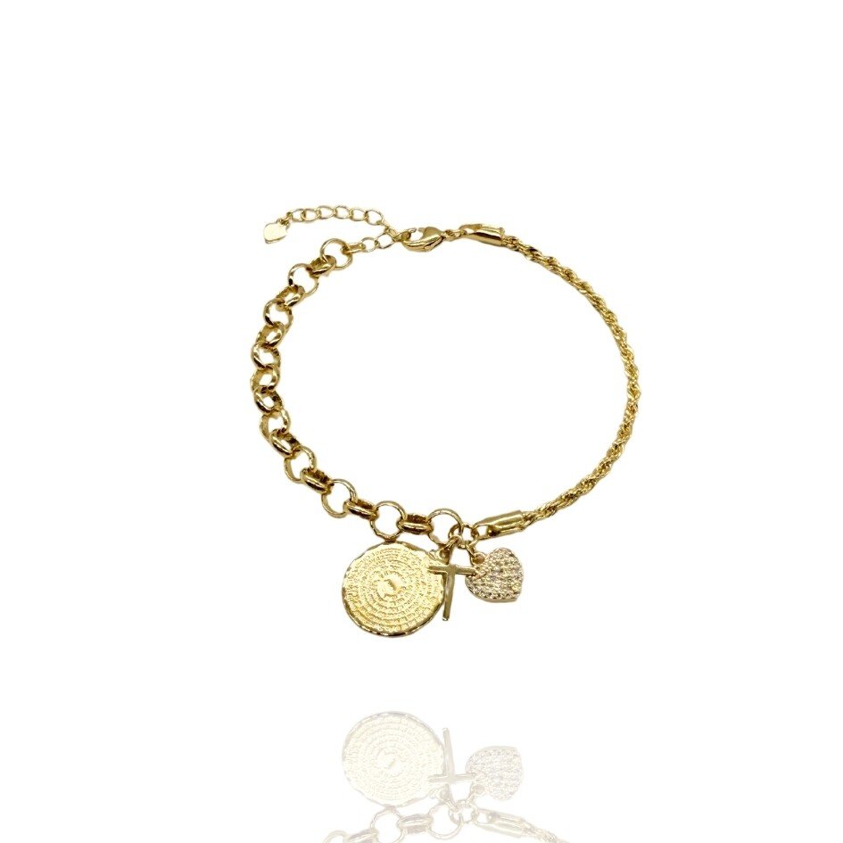 Pulseira banhada a ouro com medalha escrita a oração do pai nosso e pingentes coração e cruz.