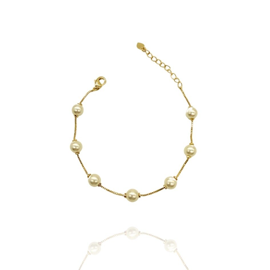 Pulseira dourada com pérolas.