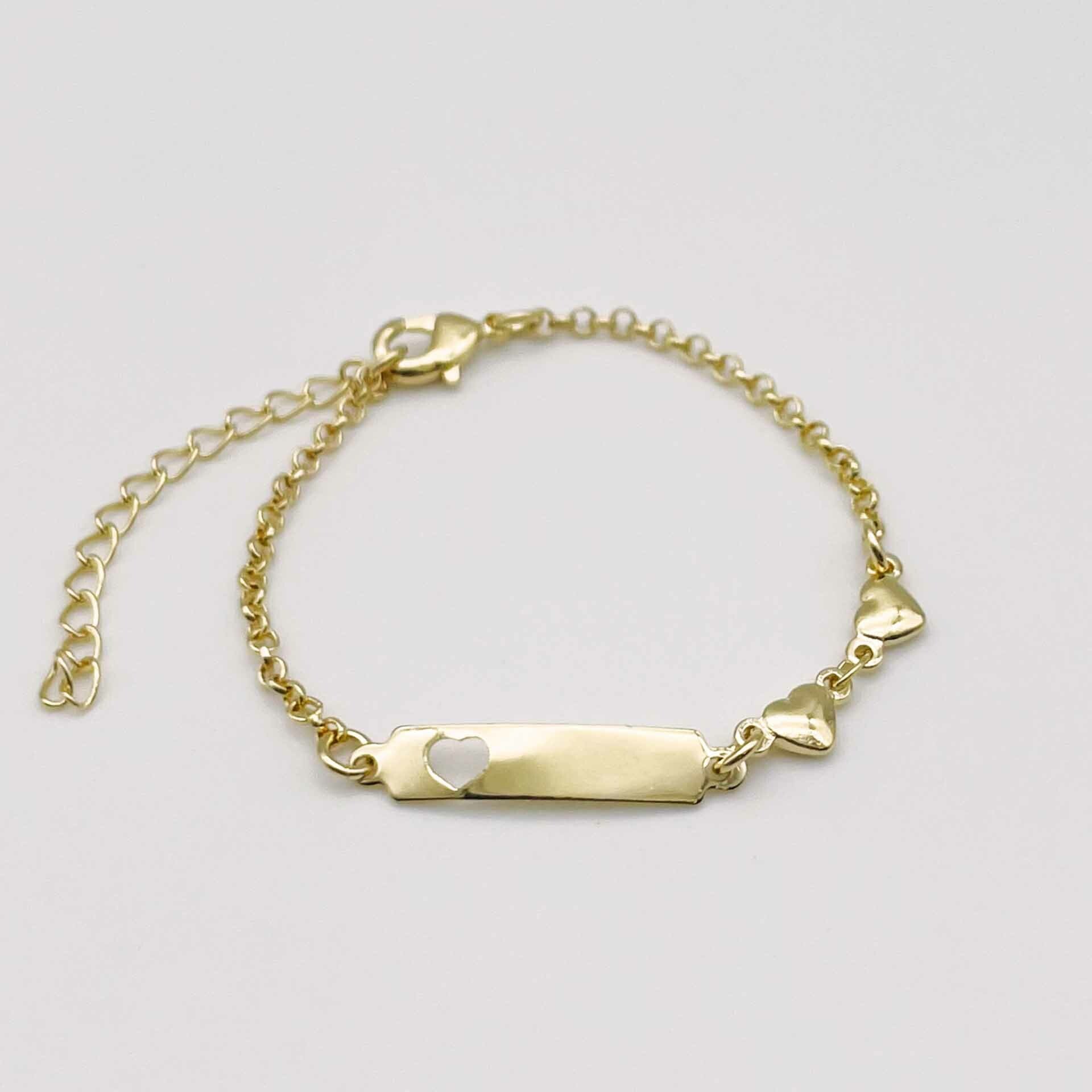 Pulseira Dourada Placa com Coração : 218309 Facebook X Pinterest WhatsApp : R$ 59,90 : R$ 56,91 UN Pix (5% ) R$ 59,90 UN Cartão de Crédito 1x R$ 59,90 - R$ 56,91 UN Pix (5% ) : - + : OK × : 1x R$ 59,90 : R$ 59,90 × : Pulseira banhada a ouro, com placa para escrita e 2 corações.Obs.: Pulseira de tamanho ajustável.Largura placa: 0,4 cmComprimento placa: 2 cmComprimento: 16 cmPeso: 2 gramasAtenção: Medidas aproximadas.