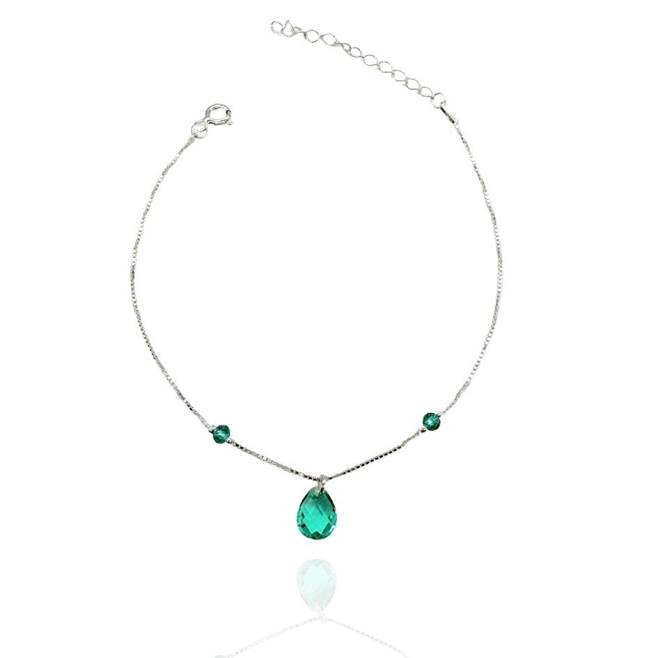 Delicada e sofisticada, esta pulseira é confeccionada em prata 925 e traz um cristal em forma de gota na elegante cor verde, que confere um toque de frescor e sofisticação ao visual. O design minimalista e atemporal combina perfeitamente com diferentes estilos e ocasiões.