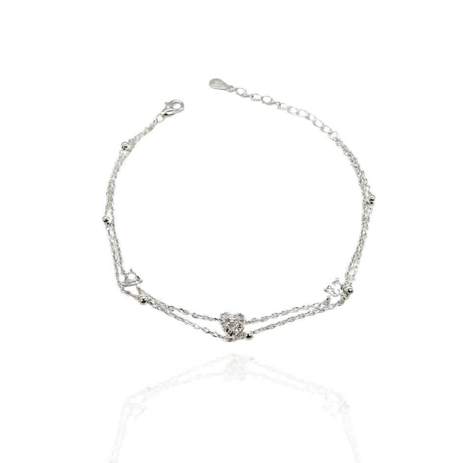 Pulseira dupla em prata 925 e pingente coração com zircônias.