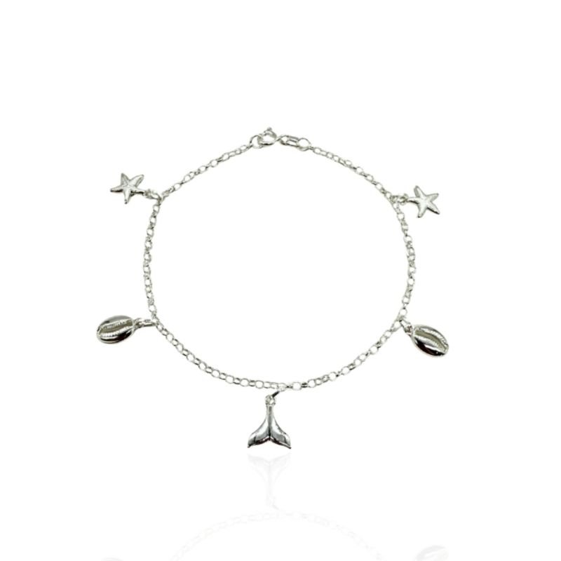 Pulseira em prata 925 com delicados pingentes de búzios, cauda de sereia e estrela do mar. Uma joia encantadora inspirada na beleza do oceano.