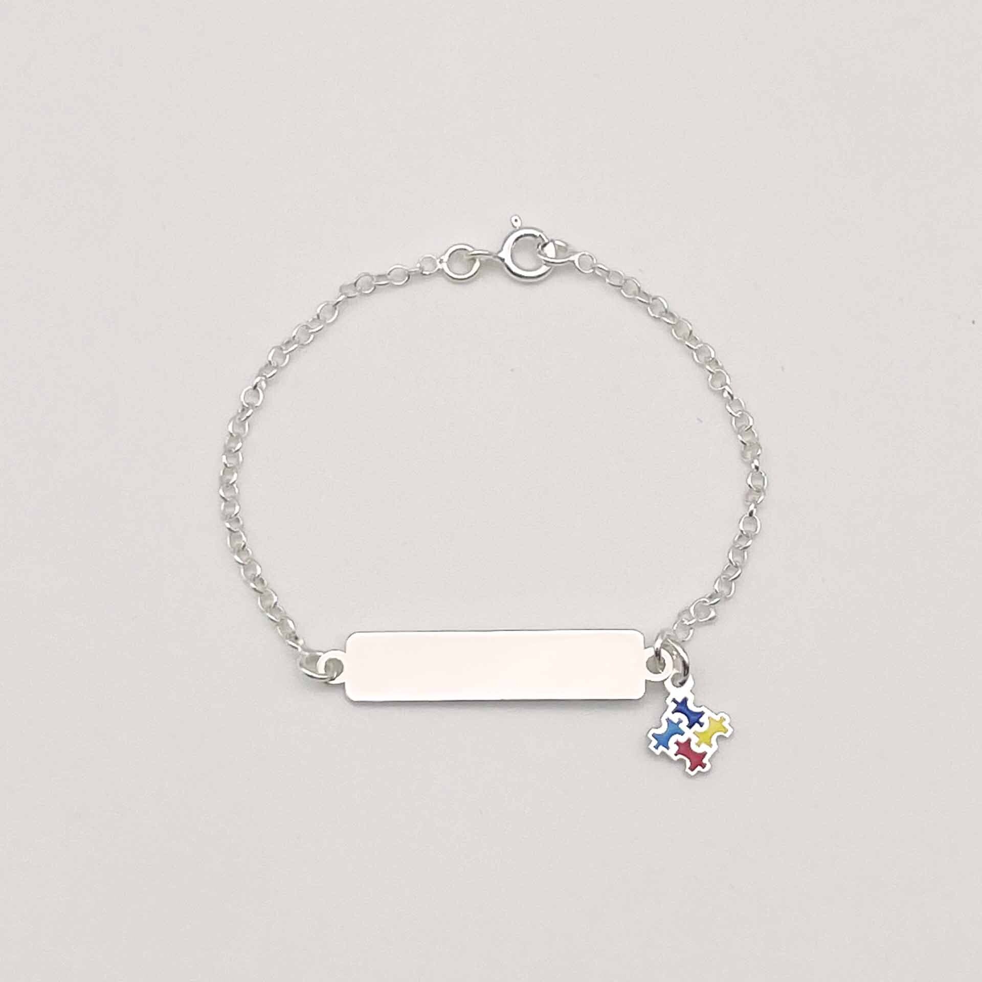 Pulseira em prata 925, com placa para escrita e símbolo quebra cabeça colorido representando o autismo.