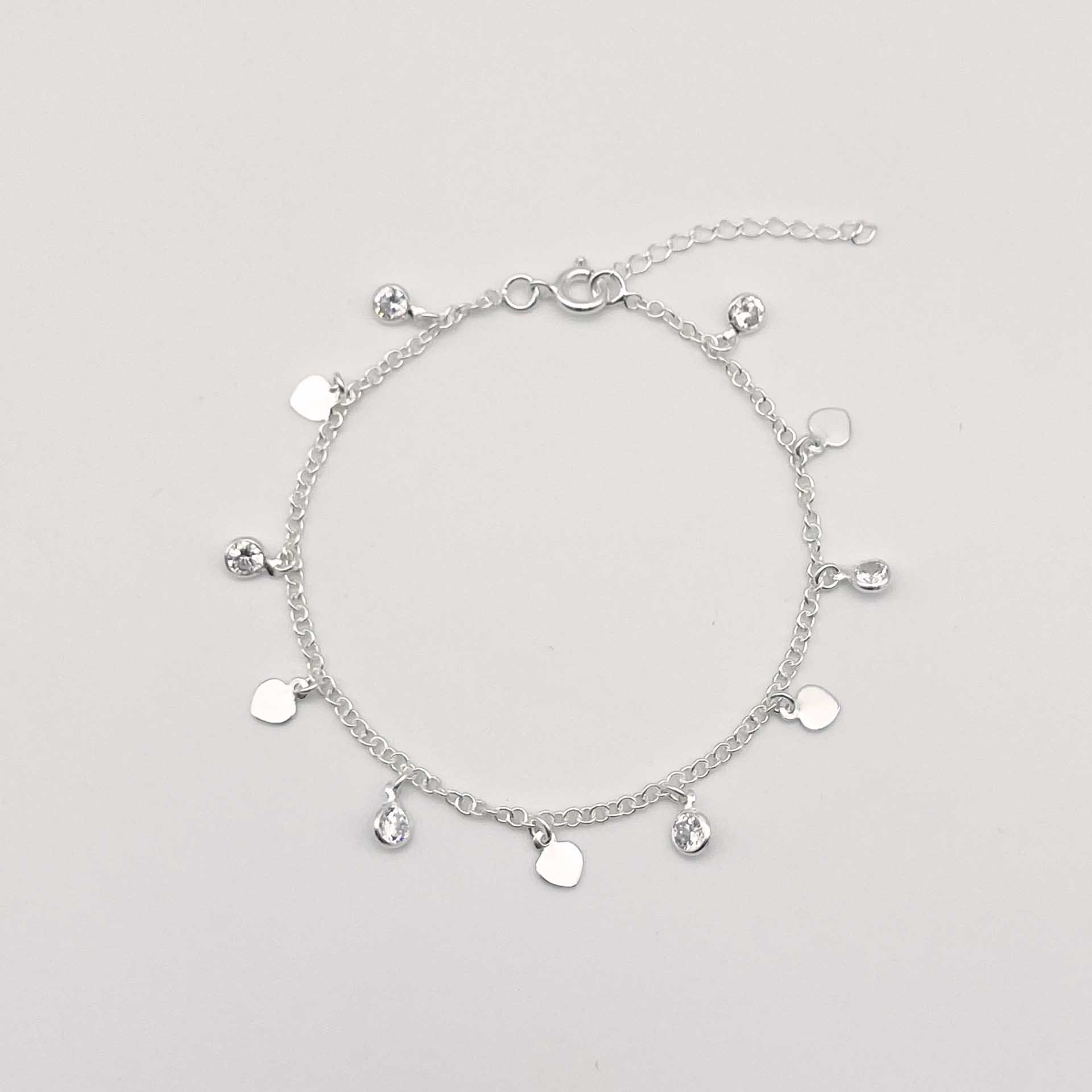 Pulseira em prata 925 com zircônias ponto de luz e medalinhas em formato de coração.