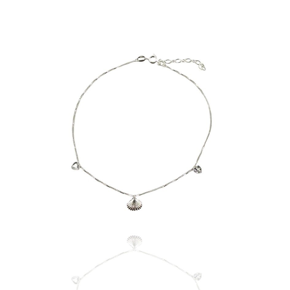 Tornozeleira com pingentes concha e zircônias. Obs.: Tornozeleira de Tornozeleira de Tornozeleira em prata 925 e de tamanho ajustável.