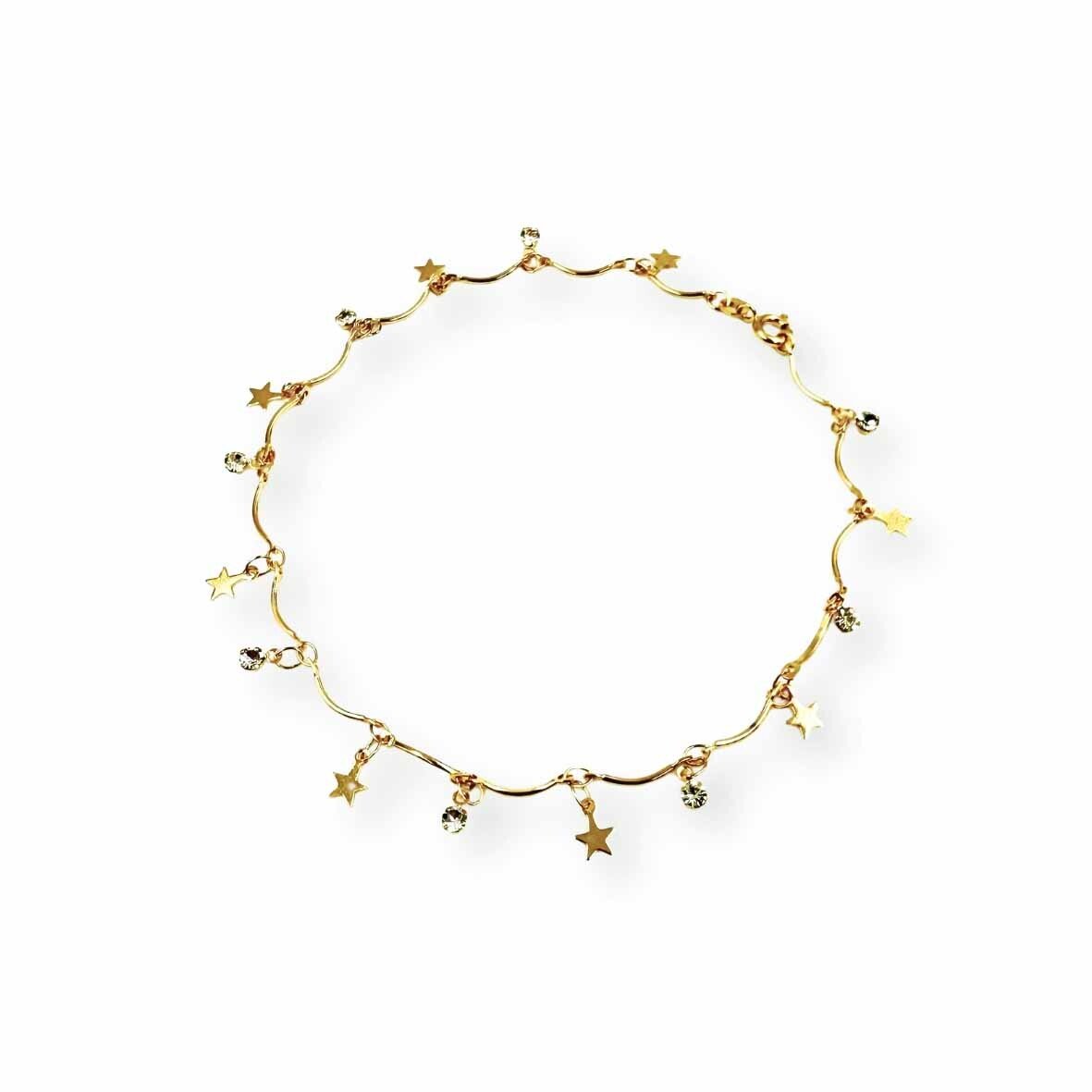 Tornozeleira banhada a ouro e pingentes em forma de estrelas e zircônias ponto de luz.