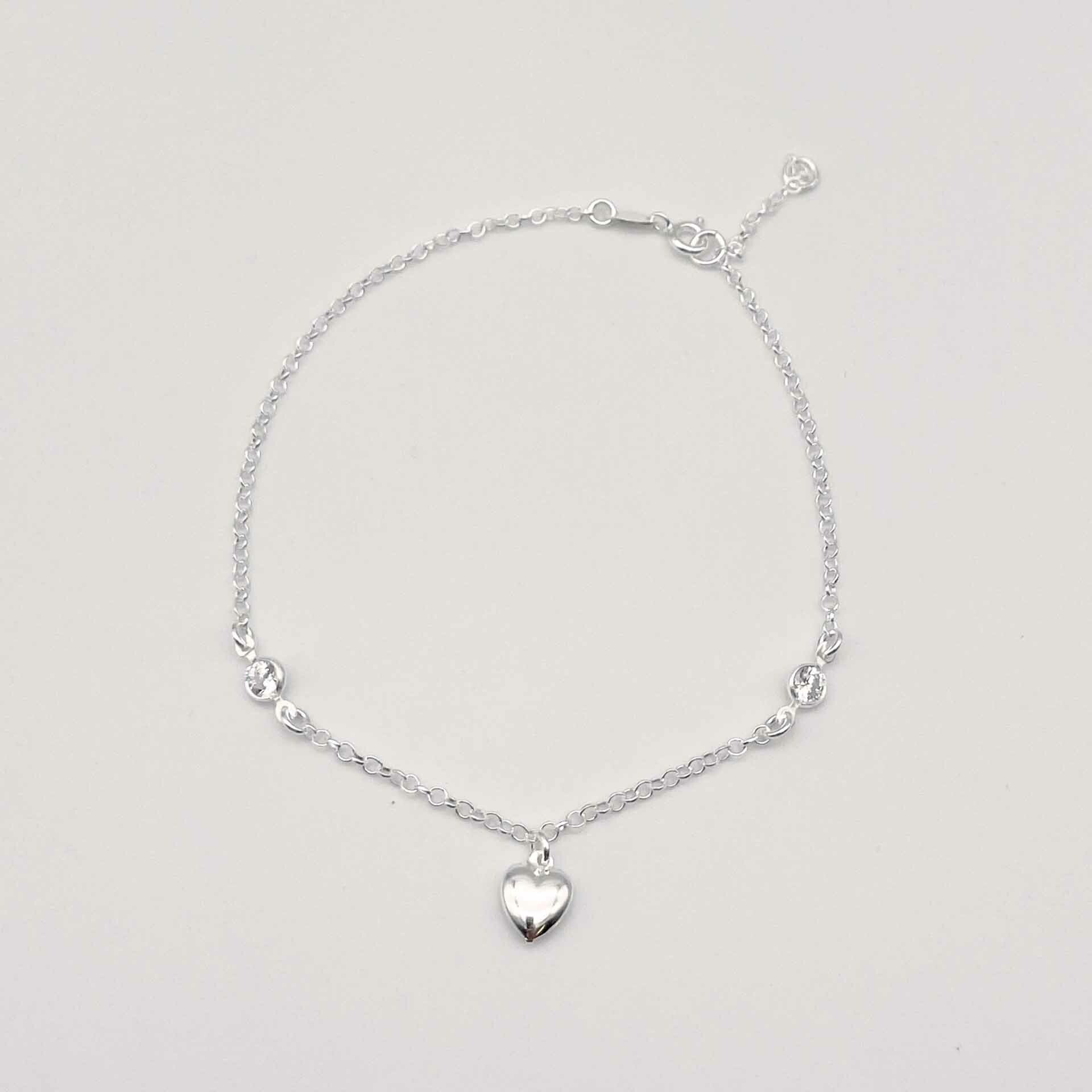 Tornozeleira em prata 925 e pingente em forma de coração liso e duas zircônias ponto de luz na malha da tornozeleira .