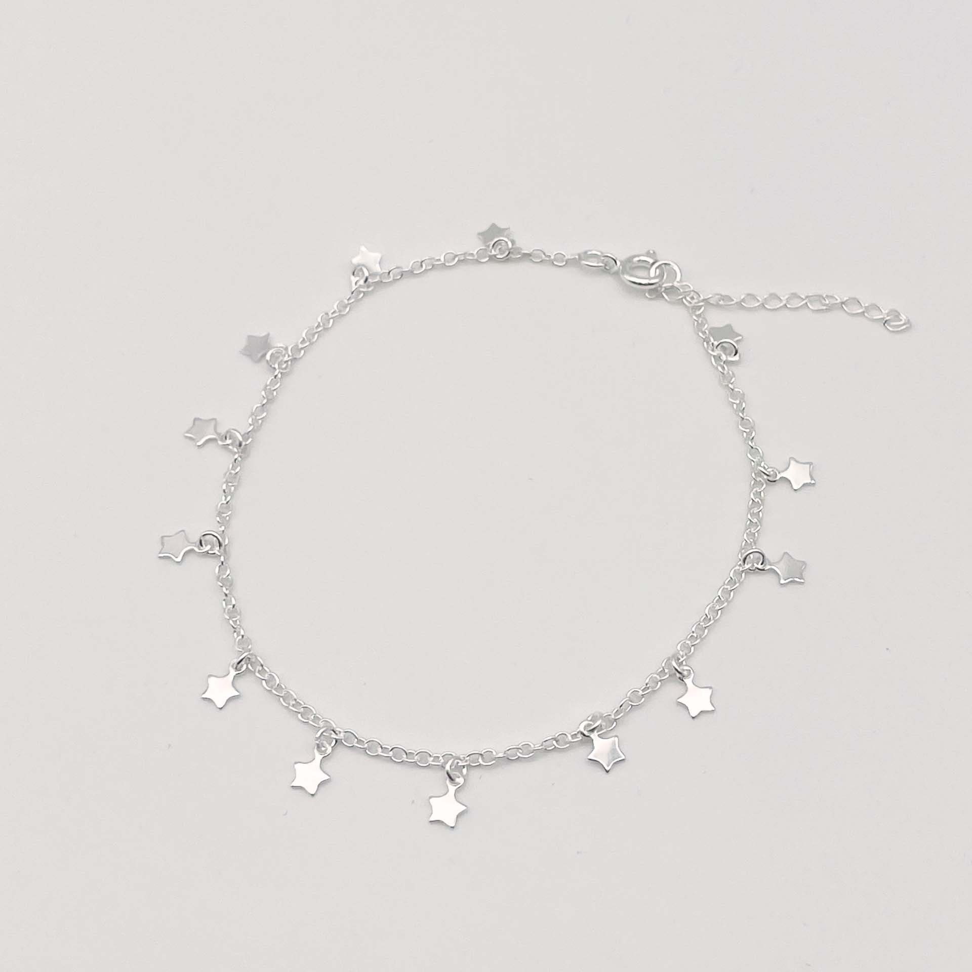 Tornozeleira em prata 925 e pingentes em forma de estrela.