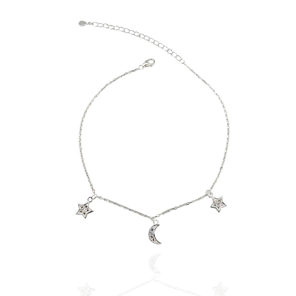 Delicada e encantadora, esta tornozeleira em prata 925 é adornada com pingentes de lua e estrelas cravejados com microzircônias brilhantes, que trazem um toque de brilho e magia ao seu visual. Ideal para quem ama acessórios com um charme celestial.
