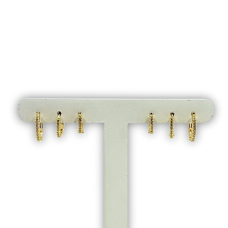 Trio de brincos banhados a ouro e em formato de argolas com zircônias.