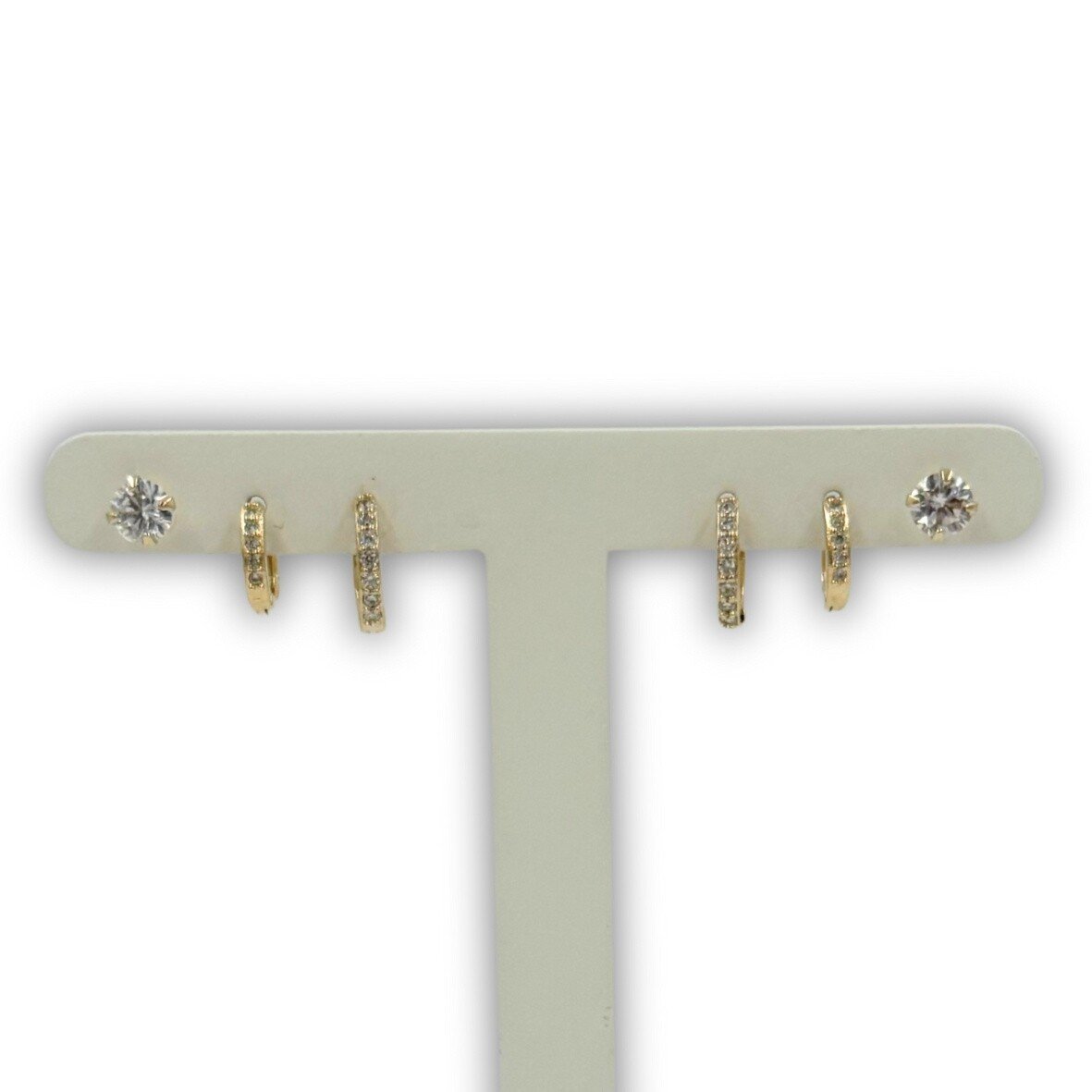 Trio de brincos composto de duas argolas de tamanhos diferentes e com zircônia e uma zircônia ponto de luz.