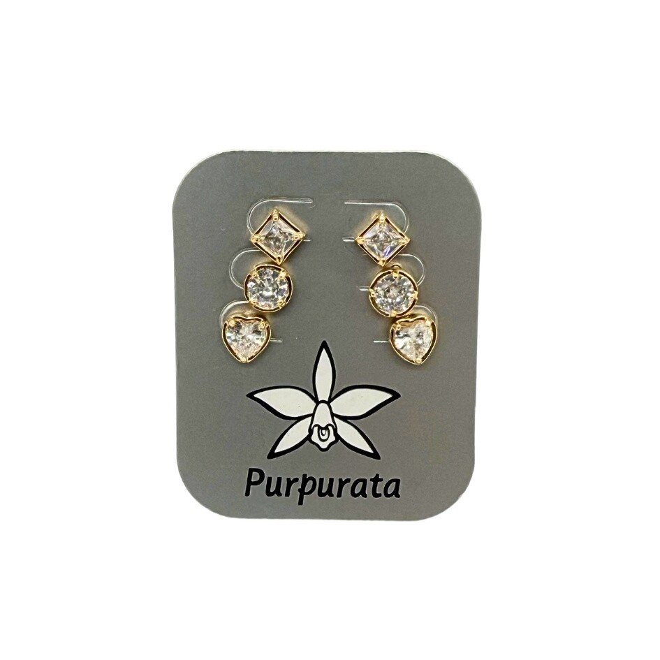 Versátil e elegante, este trio de brincos banhados a ouro conta com zircônias estilo ponto de luz em três formatos diferentes, coração, quadrado e redondo. Perfeitos para usar sozinhos ou em combinações modernas. Ideal para quem busca delicadeza com um toque de brilho em cada ocasião.