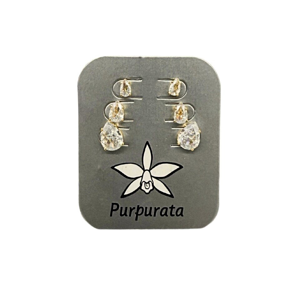 Trio de brincos com delicadas zircônias em formato de gota, em tamanhos variados, trazendo brilho e sofisticação na medida certa. Peças banhadas a ouro, perfeitas para compor looks elegantes e versáteis.