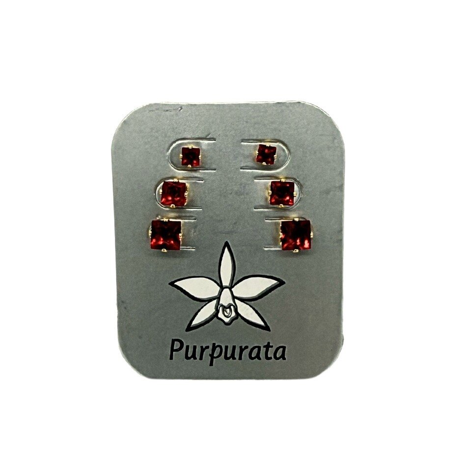 Trio de brincos banhados a ouro com zircônias ponto de luz em formato quadrado na cor vermelha. As pedras em tamanhos diferentes trazem charme e sofisticação para composições modernas e elegantes.