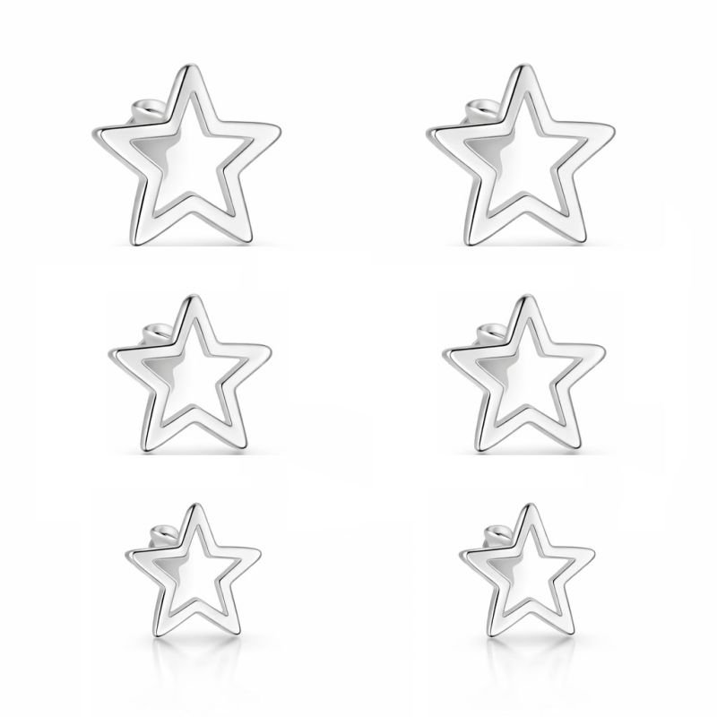 Trio de brincos com 3 estrelas vazadas e de tamanhos diferentes.